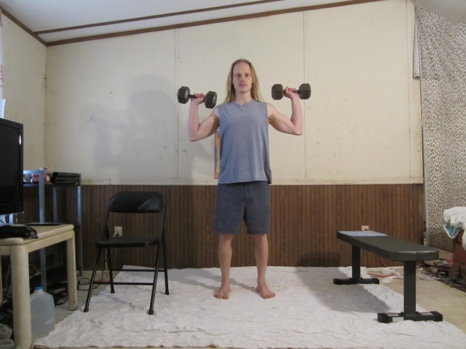 Dumbbell Standing Shoulder Press Pictures Demonstrating The Beginning, Middle, And End Of The Exercise